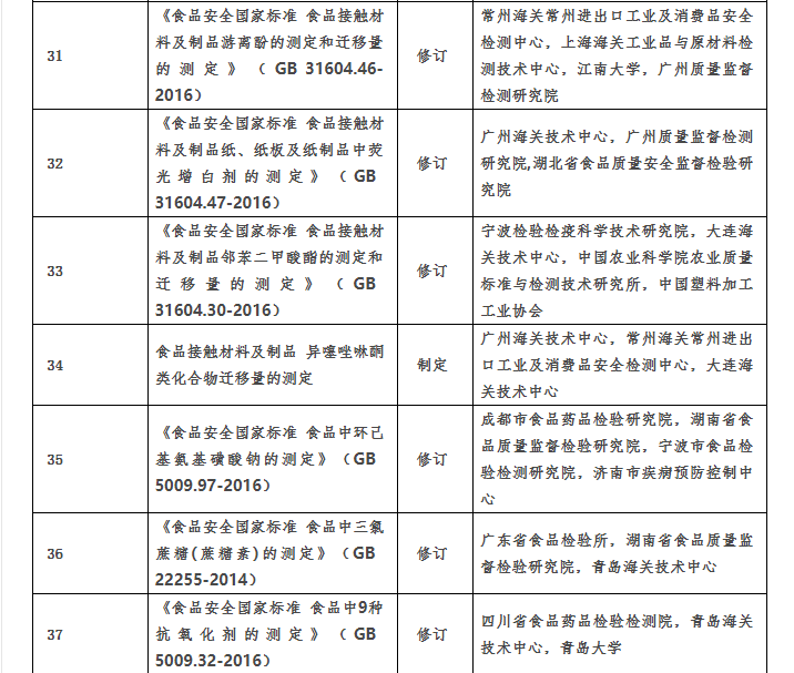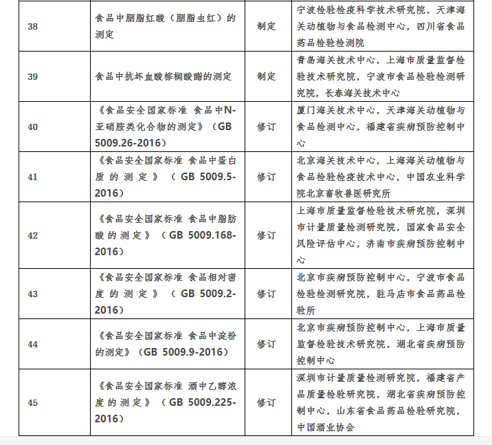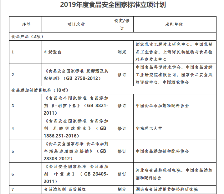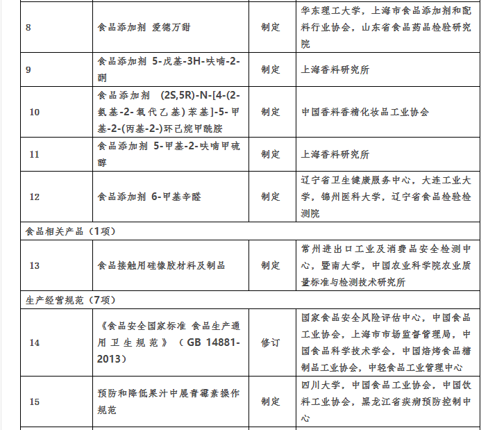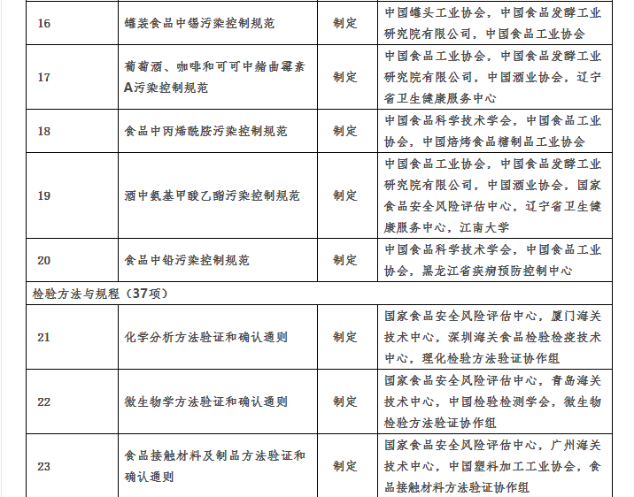 根据标准立项计划表可知,计划包括食品产品2项,食品添加剂质量规格10项,食品相关产品1项,生产经营规范7项,检验方法与规程37项。具体标准立项计划如下所示: