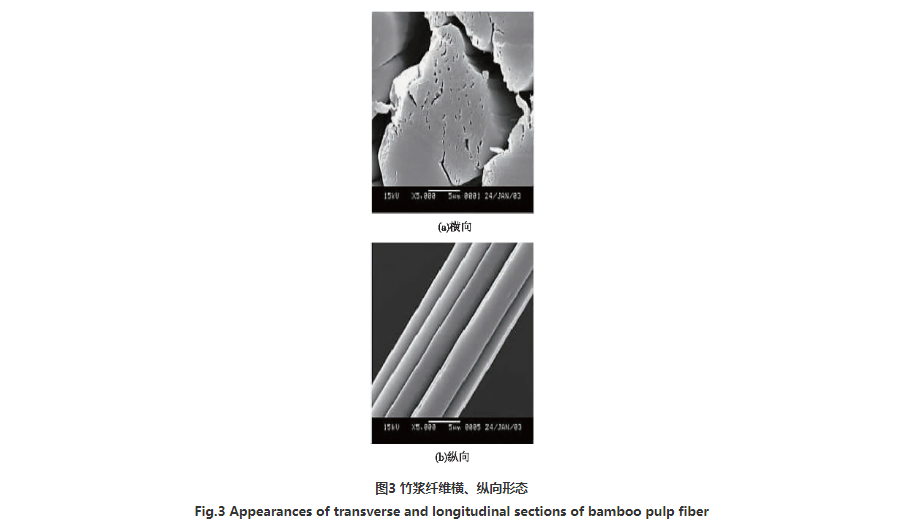1.2.2 竹浆纤维 竹浆纤维横截面为不规则的锯齿形状,其表面有向芯层弯曲的趋势;纵向平直,表面带有沟槽。竹浆纤维的纤维密度和黏胶纤维较为接近,约为1.52 g/cm3,纤维初始模量较高,抗起球和抗皱性均良好。同竹原纤维相比,竹浆纤维伸长率更大,韧性和刚性更佳,制得的产品较为挺括。此外,竹浆纤维液具有较好的吸湿放湿性能,回潮率约为11.5%,手感舒适,抗菌性能良好。竹浆纤维具有的多孔隙网状结构,可在水中瞬时膨胀,水溶性的活性染料能迅速吸附于纤维上并随之扩散,使所制成织物的染色均匀且性能优越,固色率高且具有较好的光泽。竹浆纤维横、纵向形态如图3所示[12]。