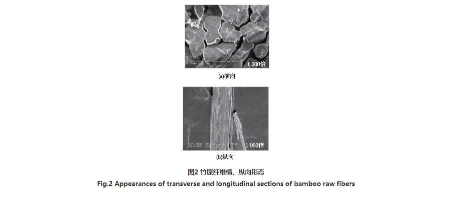 抗菌测试结果表明,竹原纤维所具备的天然抗菌性能超越人工添加的化学物质,抗菌、杀菌效果较好,其对酸臭的除臭率高达93%,氨气除臭率为70%左右[10],可有效地抑制大肠杆菌、白色念珠球菌、金黄葡萄球菌等,防紫外线性能良好[11]。竹原纤维横、纵向形态如图2所示[9]。