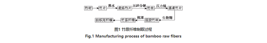 1.1.1 竹原纤维 竹原纤维是采用物理、化学等方法制备而成的天然竹纤维[7],其主要制取过程如图1所示。①利用机械方式将原竹材进行加工,得到竹片;②将竹片在沸水中进行煮炼;③通过压碎装置将竹丝分解成细丝状;④待得到细小竹丝之后,将其放入压力锅中进行蒸煮,以便去除部分果胶、半纤维素、木质素;⑤利用生物酶进一步分解竹丝中的木质素、半纤维素、果胶,以获取纤维素纤维;⑥对得到的纤维素纤维进行清洗、漂白、上油、开松梳理,最终获得竹原纤维。