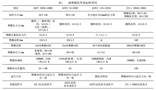 耐摩擦色牢度的原理是将纺织试样分别与一块干摩擦布和一块湿摩擦布摩擦,最终评定摩擦布的沾色程度。常用的标准有GB/T 3920—2008、AATCC 8—2007、AATCC 116—2010和JIS L 0849—2004,这4个标准的异同见表1。