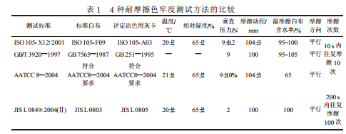 在诸多纺织品色牢度质量检验中, 耐摩擦色牢度是其中重要的一项。 不同组织、 国家耐摩擦色牢度的标准和测试方法都有一些差异, 而不同的测试方法对测定结果有一定的影响。 目前, 国际上耐摩擦色牢度的测试方法标准主要有国际标准化组织标准 ISO 105- X12: 2001《纺织品色牢度试验第X12部分:耐 摩擦色牢度》、我国国家标准GB/T3920—1997《纺织品色牢度试验耐摩擦色牢度》、美国纺织化学家和染色家协会标准 AATCC8—2004《耐摩擦色牢度: AATCC 耐摩擦色牢度实验仪测试方法》和日本工业标准 JIS L 0849: 2004《耐摩擦色牢度试验方法》。 上海千实就这 4 种标准的测试方法以及不同测试方法对测定结果的影响进行分析和比较。