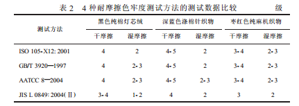 从表1、表2中可以看出, 标准摩擦白布的类型、白布的含水率、测试时的温度、湿度、垂直压力、摩擦动程、摩擦方向、摩擦次数等测试参数对测试结果都有一定影响, 对于同一试样, 不同耐摩擦色牢度测试方法所得的数据会有0.5 ~1.0 级之差。如果仅从测试结果 (级数) 看, 除日本 JIS 标准所测得结果相对低0.5 ~ 1.0 级外, 其他 3 个标准测得的数据基本一致。若要判定纺织品耐摩擦色牢度是否合格,还要依据各国或贸易合同双方对耐摩擦色牢度的限定值。 我国大部分服装产品标准规定, 服装面料(一等品) 的耐干摩擦色牢度一般应达到3 - 4级, 耐湿摩擦色牢度应达到 3 级(深色产品可低半级); 而对于出口产品, 耐湿摩擦色牢度则一般要求达到 3 级以上。