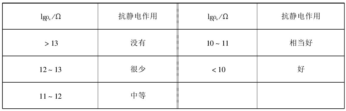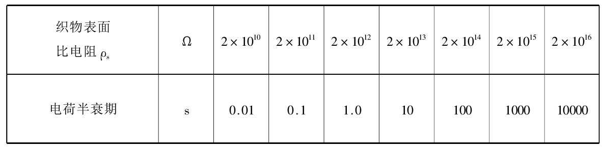 织物表面比电阻与电荷半衰期、抗静电作用的关系如表所示。