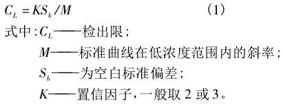 估算方法,于1998年又发表了《分析术语纲要》对检出限检出,检出限的定义为:某特定方法在给定的置信度内可从样品中检出待测物质的最小浓度或量,公式表示为: