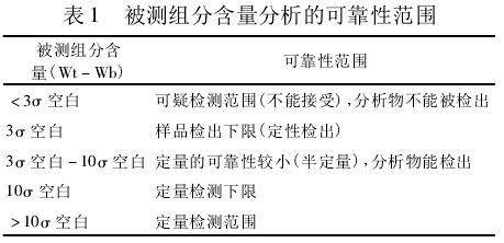 正因为如此,在实际使用中,样品检出限要比方法检出限要有意义得多。当被测样品种类变化或测定所用试剂和环境变化时,即使使用同一分析方法,样品检出 限可能相差很大。在痕量分析时,测量结果的可靠性在很大程度上取决于空白值的大小及空白值的波动情况。设 Wt代表被测样品的总值,Wb 代表空白值,则被测组分的含量( Wt-Wb)与检测可靠性的关系如表1所示( 表中”σ空白”为测定分析空白时的标准偏差)。