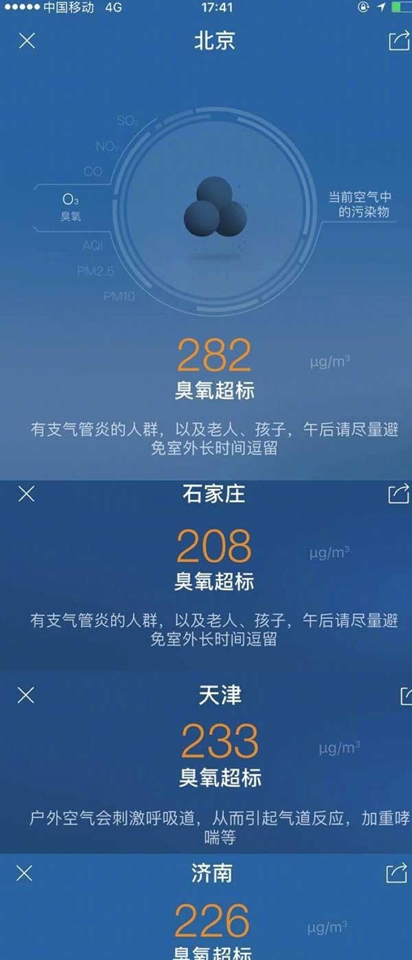 跟PM2.5产生的健康损伤不同,臭氧浓度超标会对人体造成急性伤害。臭氧会直接刺激皮肤、眼睛、呼吸道等部位,引起气道反应和气道炎症增加、哮喘加重等。当臭氧浓度达到1毫克/升时,可造成呼吸加速、胸闷、口干舌燥、嗓子疼、咳嗽等;2.5~5毫克/升可引起心跳加快、呼吸困难、疲倦、头痛,停留时间久了可发生肺气肿,严重时有生命危险。研究发现,空气中每立方米臭氧含量增加100微克,呼吸功能就会减弱3%。