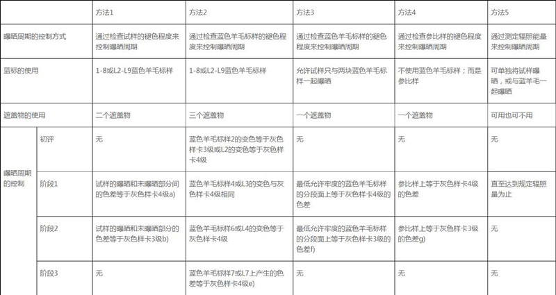 从全方位的角度来看,方法1虽然精确,但一个试样配备一套蓝标的做法似乎有些奢侈,而使用检查样品的颜色变化的方式控制曝晒周期的做法更是由于个体样品耐光牢度的千变万化而难以及时准确的控制。因此,不到万不得已检测机构一般是不会使用此方法的。再看方法2,虽然是一批试样使用一套蓝标,但超长的曝晒周期限制了方法的使用。现在委托检验的客户一般都要求尽可能快地拿到检测结果,而方法2动辄几百小时的实验周期和过高的测试费用显然是让客户无法接受。说到方法3,与前面两个方法相比,该方法的优势明显。首先是蓝标使用少,曝晒周期可长可短灵活控制,这些无疑都较低了测试成本;其次整个曝晒周期只有两个阶段,操作比较简单、方便。但正如前面讲到的,该方法只使用2块蓝标,对于某些样品只能给出一个范围值,如符合或不符合某级,无法给出一个确切值,因此也有其局限性。至于方法4和方法5,这两种方法在实际检测中使用较少。