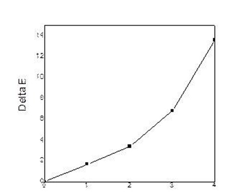 人们一般选择蓝色羊毛标样或样品的曝晒与未曝晒部分之间的颜色变化等于灰色样卡4级和3级作为控制曝晒时间的基准。之所以选择灰色样卡4级和3级是因为人眼感觉颜色差别达到灰色样卡3级时较明显,此时进行评级较为科学。另外,蓝色羊毛标样在这个区间代表颜色变化的△E*与时间之间的曲线接近线性(见图1),其结果更具有一致性。而在GB250-1995中,也指出灰色样卡4级对应△E*的值是1.7±0.3,而灰色样卡3级对应△E*的值是3.4±0.4。
