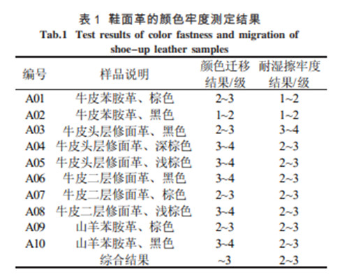 本质而言,色迁移属于颜色牢度(抵抗外界作用而不变色的能力)的范畴,但与耐摩擦、耐水渍、耐热、耐光等色牢度相比,颜色迁移是更复杂的过程。关于纺织品中颜色的迁移研究已有较多的文献发表,都对可能影响颜色迁移的因素如染料的结合力、溶剂、助剂、颜料与树脂的相溶性等进行了论述。然而,针对皮革内颜色迁移的研究文献鲜有报道。本文基于标准ISO 15701中的内容,对目前国内汽车用皮革、家具革及鞋面革的颜色迁移情况进行检测,对颜色迁移程度进行对比分析,同时与耐湿擦牢度结果进行对比,分析两种色牢度结果的相关性。
