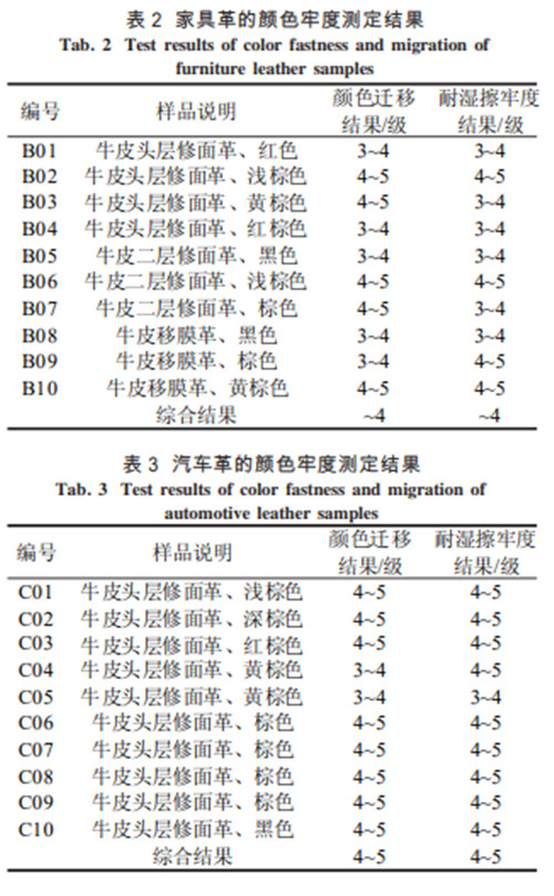 所筛选出的鞋面革、家具革及汽车革的颜色迁移测定结果分别汇总于表1、表2和表3中。分析表1中数据可知,所测试的鞋面革颜色迁移等级平均为3,表明样品中颜色迁移明显,而且个别样品颜色迁移严重(如A02)。表2中数据表明,所测试的家具革颜色迁移等级平均在4之间,表明样品中颜色有轻度的迁移。表3中数据表明,所测试汽车革颜色迁移等级基本在4~5之间,表明样品中的颜色基本无迁移。