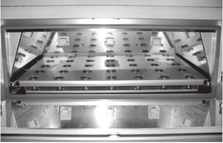 通过在转鼓设备中的样品架底部安装1个杯子来测量喷淋到单块试板上的水量,喷淋到试板上的水沿着试板滴落到杯子里,一定时间后,测量杯子中的水量。平板式试验箱里安装了经过改良的、可以安装35个杯子的样品架(见图1),该样品架能够在喷淋循环中收集水,然后测量每个杯子里的水量。这个方法不仅可以测量任何一次喷淋循环的水量,而且可以测试喷淋水量的均匀性。