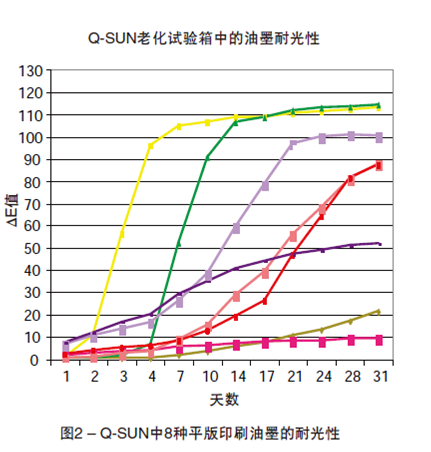 大约一个月的时间里,这些极端的、真实测试环境可以迅速区分耐光性好的和差的油墨。不同曝晒季节或曝晒地点,测试都快速、有效,而且油墨的相对排序都非常相似。自然曝晒试验中唯一的差异是各种试样性能退化的速度。