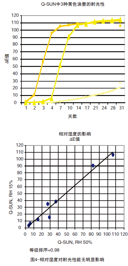 为了确定RH(相对湿度)的作用,同时使用相对湿度为50%(Xe-3-H机型)和有效相对湿度约为15%(Xe-1机型)的两种不同Q-SUN试验箱对油墨进行暴露测试。图4对暴露试验10天后的结果进行对比。所得数据有非常好的相关性。相对湿度对这些油墨的影响非常小。
