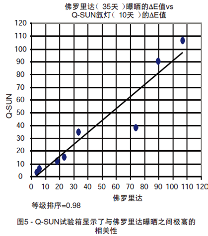 Q-SUN试验箱测试结果和户外数据进行对比。图5比较了使用Q-SUN试验箱暴露10天和佛罗里达玻璃框下曝晒35天的数据。