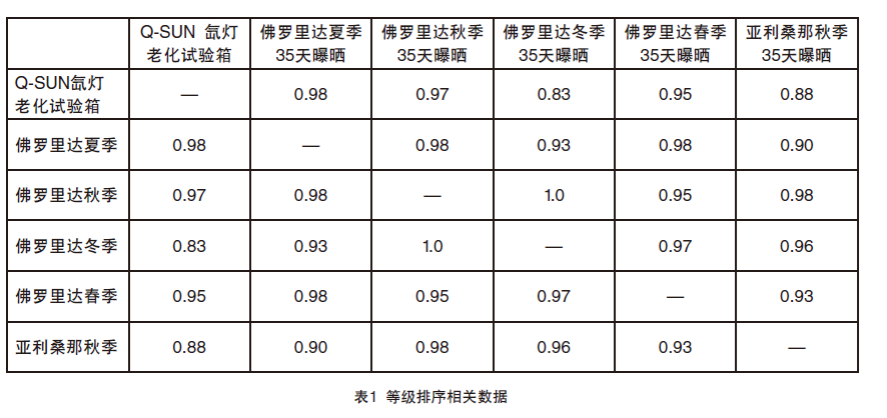 如表1所示,Q-SUN试验箱测试和户外曝晒结果的等级排序具有非常高的一致性。